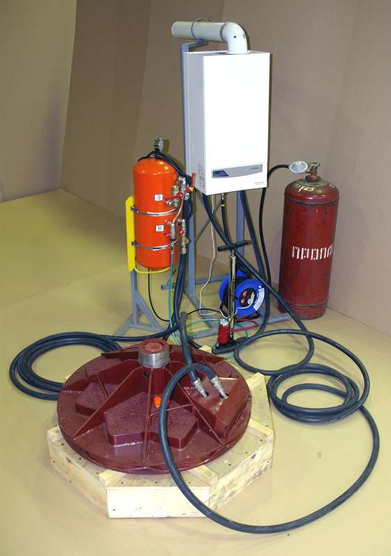 Для нормального функционирования оборудования отопительный котел, монжус и газовый баллон стационарно размещают в теплом вагончике, который устанавливается вблизи места испытания.