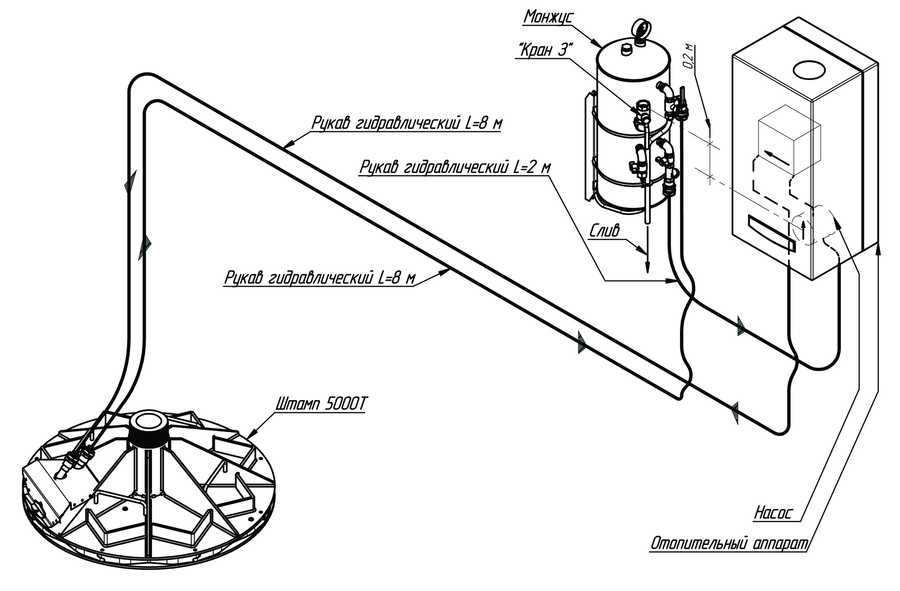 К нижней поверхности штампа жестко закреплена тепловая плита, внутри которой расположен кольцевой нагревательный элемент, выполненный виде плоской спирали из медной трубки, по которой циркулирует теплоноситель. В качестве устройства для нагрева теплоносителя используется отопительный котел газового или электрического типа, который обеспечивает циркуляцию и нагрев теплоносителя до заданной температуры. Котел соединен со штампом рукавами длиной 8 метров. Монжус предназначен для хранения теплоносителя, заправки системы и создания избыточного давления, необходимого для работы оборудования.