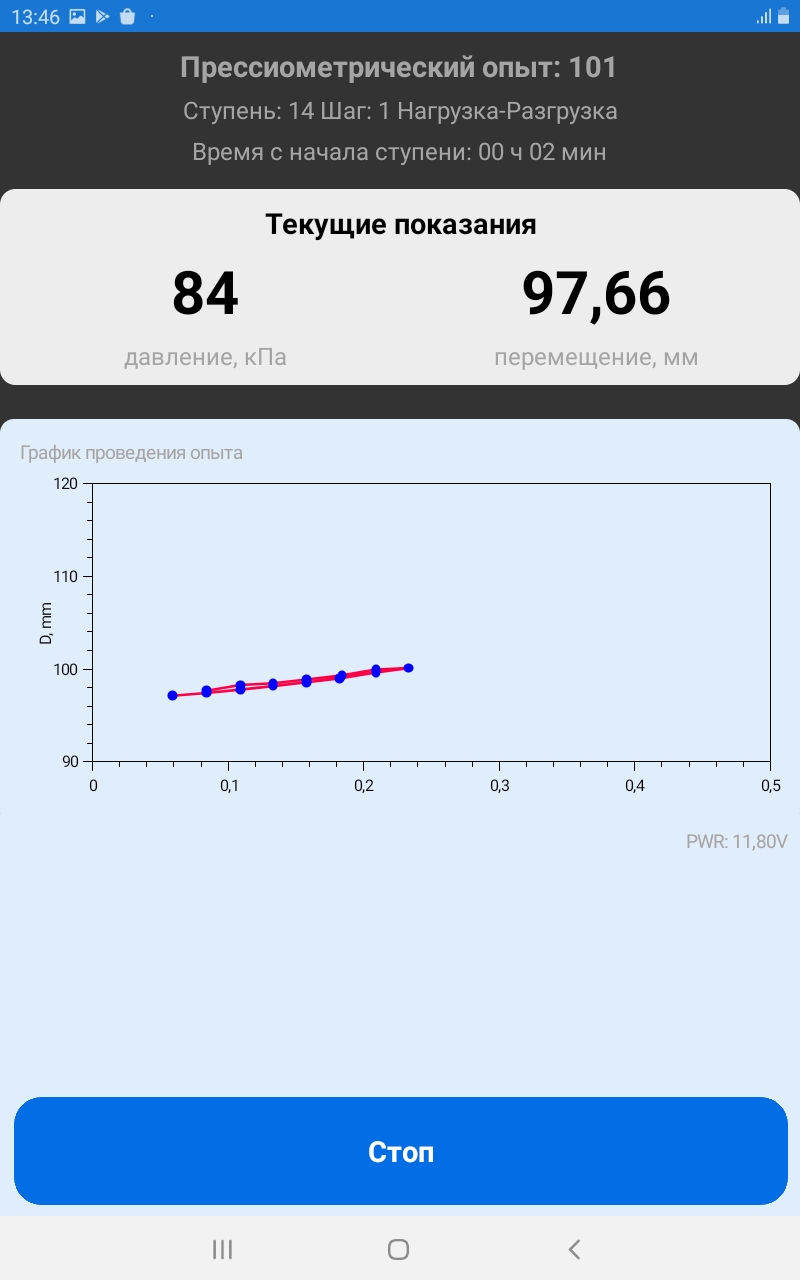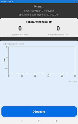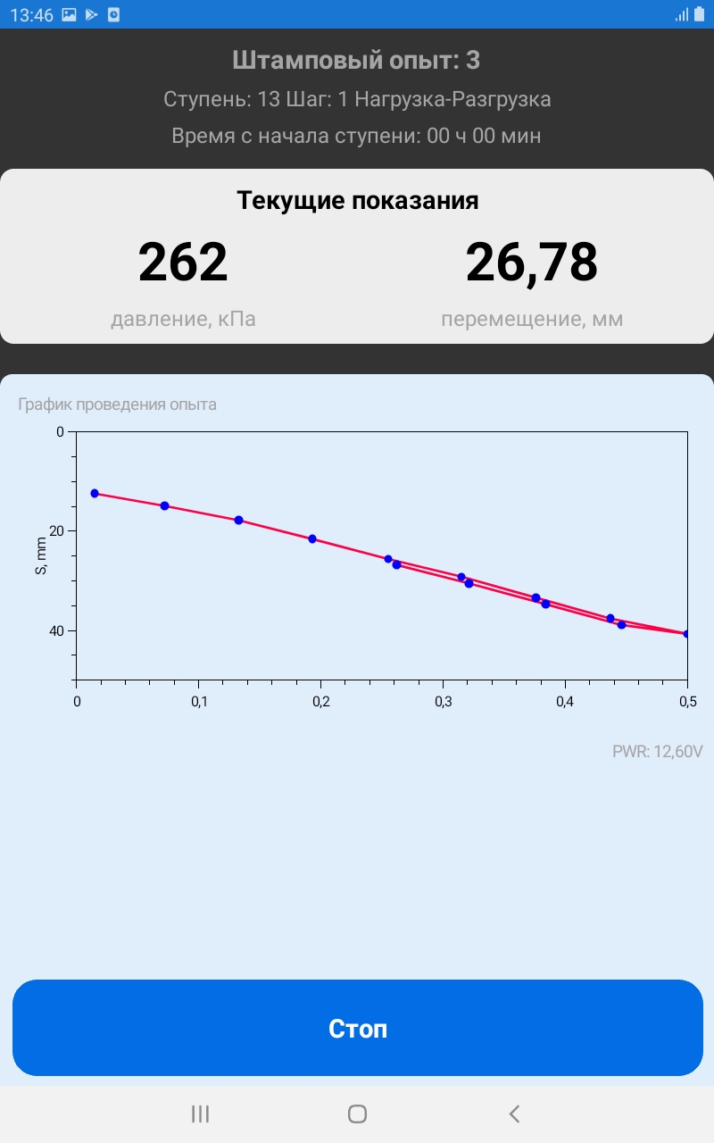 Вид испытания (штамповый или прессиометрический) определяется автоматически. На экране можно наблюдать текущее давление в пневмосистеме, осадку или перемещение в миллиметрах. Схема испытания, номер ступени и шага, а также время прошедшее с начала ступени так же отображаются в приложении.